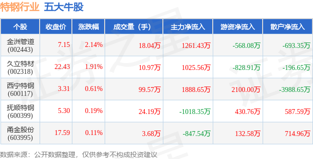 个股表现方面,特钢行业当日领涨股为金洲管道(002443),该股当日报收7.15,上涨2.14%,成交量18.04万,主力资金净流入1261.43万元。久立特材(002318)以上涨1.91%紧随其后,该股当日成交量10.97万,主力资金净流入1025.56万元。除此之外,西宁特钢(600117)、抚顺特钢(600399)、甬金股份(603995)均进入当日牛股之列。具体个股列表见下表: