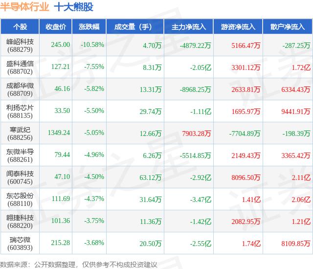 个股表现方面,半导体行业当日领跌股为峰岹科技(688279),该股当日报收245.0,下跌10.58%,成交量4.7万,主力资金净流出4879.22万元。盛科通信(688702)以下跌7.55%紧随其后,该股当日成交量8.31万,主力资金净流出2.05亿元。除此之外,成都华微(688709)、利扬芯片(688135)、寒武纪(688256)均进入当日熊股之列。具体个股列表见下表: