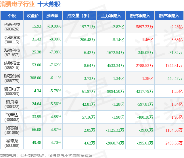 个股表现方面,消费电子行业当日领跌股为科森科技(603626),该股当日报收15.93,下跌10.0%,成交量197.71万,主力资金净流出2.82亿元。长盈精密(300115)以下跌8.9%紧随其后,该股当日成交量206.48万,主力资金净流出5.14亿元。除此之外,泓禧科技(871857)、统联精密(688210)、影石创新(688775)均进入当日熊股之列。具体个股列表见下表: