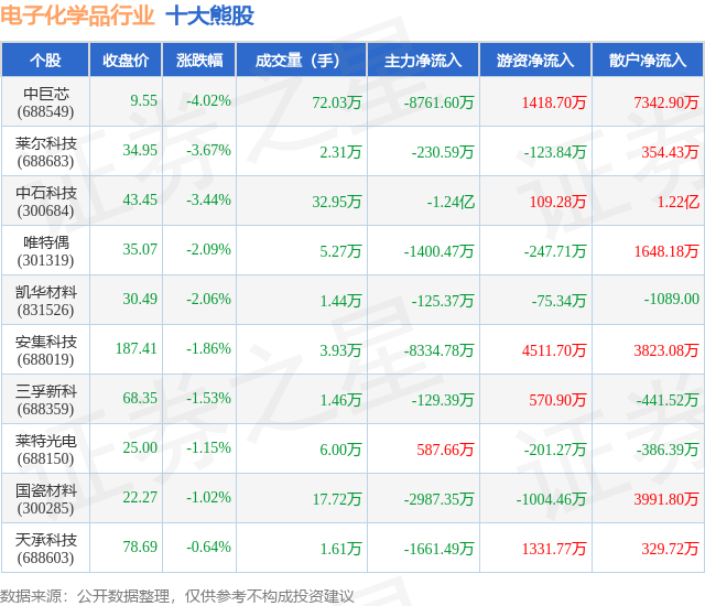 个股表现方面,电子化学品行业当日领跌股为中巨芯(688549),该股当日报收9.55,下跌4.02%,成交量72.03万,主力资金净流出8761.6万元。莱尔科技(688683)以下跌3.67%紧随其后,该股当日成交量2.31万,主力资金净流出230.59万元。除此之外,中石科技(300684)、唯特偶(301319)、凯华材料(831526)均进入当日熊股之列。具体个股列表见下表: