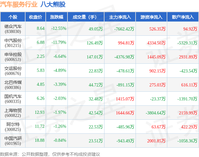 个股表现方面,汽车服务行业当日领跌股为德众汽车(838030),该股当日报收8.64,下跌12.55%,成交量49.05万,主力资金净流出7662.42万元。中汽股份(301215)以下跌11.79%紧随其后,该股当日成交量126.49万,主力资金净流入994.81万元。除此之外,申华控股(600653)、交运股份(600676)、北巴传媒(600386)均进入当日熊股之列。具体个股列表见下表: