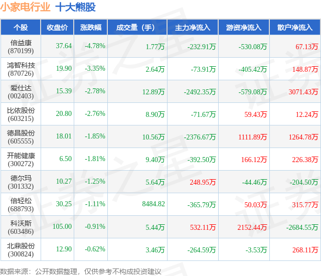 个股表现方面,小家电行业当日领跌股为倍益康(870199),该股当日报收37.64,下跌4.78%,成交量1.77万,主力资金净流出232.91万元。鸿智科技(870726)以下跌3.35%紧随其后,该股当日成交量2.64万,主力资金净流出73.91万元。除此之外,爱仕达(002403)、比依股份(603215)、德昌股份(605555)均进入当日熊股之列。具体个股列表见下表: