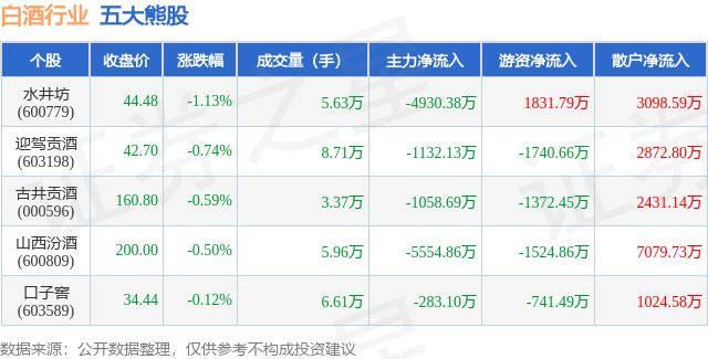 个股表现方面,白酒行业当日领跌股为水井坊(600779),该股当日报收44.48,下跌1.13%,成交量5.63万,主力资金净流出4930.38万元。迎驾贡酒(603198)以下跌0.74%紧随其后,该股当日成交量8.71万,主力资金净流出1132.13万元。除此之外,古井贡酒(000596)、山西汾酒(600809)、口子窖(603589)均进入当日熊股之列。具体个股列表见下表: