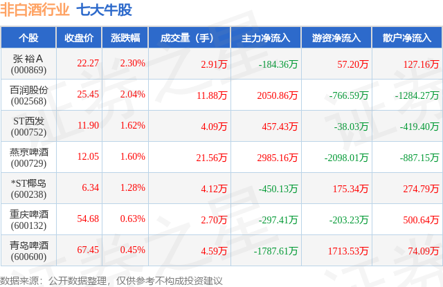 个股表现方面,非白酒行业当日领涨股为张 裕A(000869),该股当日报收22.27,上涨2.3%,成交量2.91万,主力资金净流出184.36万元。百润股份(002568)以上涨2.04%紧随其后,该股当日成交量11.88万,主力资金净流入2050.86万元。除此之外,ST西发(000752)、燕京啤酒(000729)、*ST椰岛(600238)均进入当日牛股之列。具体个股列表见下表: