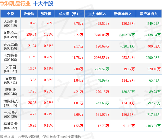 个股表现方面,饮料乳品行业当日领涨股为天润乳业(600419),该股当日报收10.28,上涨1.78%,成交量8.76万,主力资金净流入428.52万元。东鹏饮料(605499)以上涨1.25%紧随其后,该股当日成交量2.27万,主力资金净流入7240.08万元。除此之外,养元饮品(603156)、西部牧业(300106)、李子园(605337)均进入当日牛股之列。具体个股列表见下表: