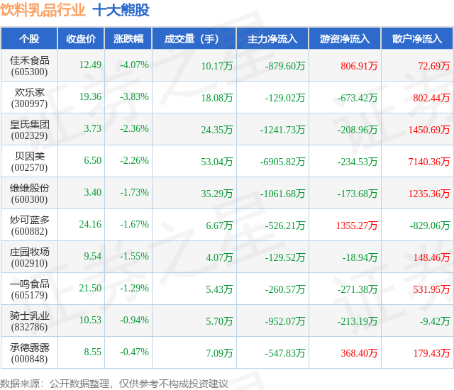 个股表现方面,饮料乳品行业当日领跌股为佳禾食品(605300),该股当日报收12.49,下跌4.07%,成交量10.17万,主力资金净流出879.6万元。欢乐家(300997)以下跌3.83%紧随其后,该股当日成交量18.08万,主力资金净流出129.02万元。除此之外,皇氏集团(002329)、贝因美(002570)、维维股份(600300)均进入当日熊股之列。具体个股列表见下表: