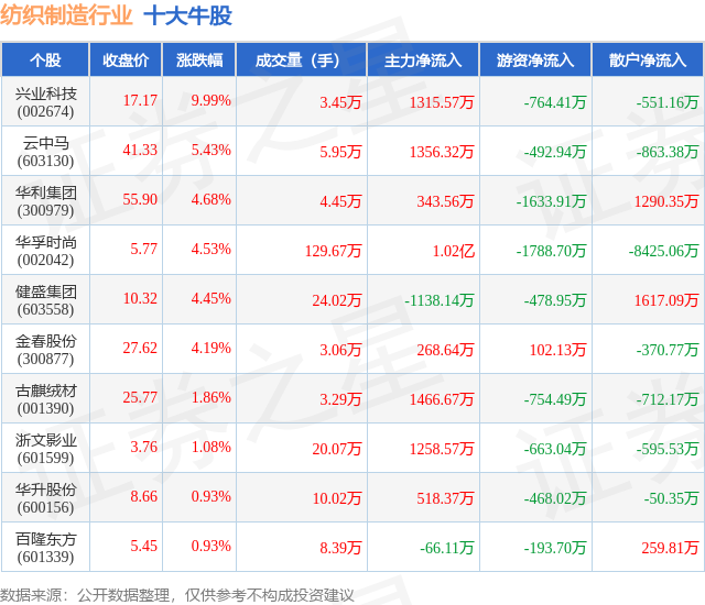 个股表现方面,纺织制造行业当日领涨股为兴业科技(002674),该股当日报收17.17,上涨9.99%,成交量3.45万,主力资金净流入1315.57万元。云中马(603130)以上涨5.43%紧随其后,该股当日成交量5.95万,主力资金净流入1356.32万元。除此之外,华利集团(300979)、华孚时尚(002042)、健盛集团(603558)均进入当日牛股之列。具体个股列表见下表: