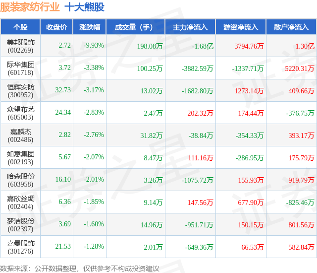 个股表现方面,服装家纺行业当日领跌股为美邦服饰(002269),该股当日报收2.72,下跌9.93%,成交量198.08万,主力资金净流出1.68亿元。际华集团(601718)以下跌3.38%紧随其后,该股当日成交量100.25万,主力资金净流出3882.59万元。除此之外,恒辉安防(300952)、众望布艺(605003)、嘉麟杰(002486)均进入当日熊股之列。具体个股列表见下表: