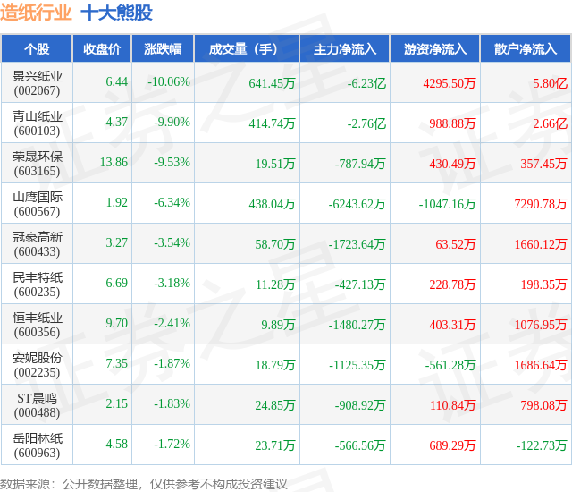 个股表现方面,造纸行业当日领跌股为景兴纸业(002067),该股当日报收6.44,下跌10.06%,成交量641.45万,主力资金净流出6.23亿元。青山纸业(600103)以下跌9.9%紧随其后,该股当日成交量414.74万,主力资金净流出2.76亿元。除此之外,荣晟环保(603165)、山鹰国际(600567)、冠豪高新(600433)均进入当日熊股之列。具体个股列表见下表: