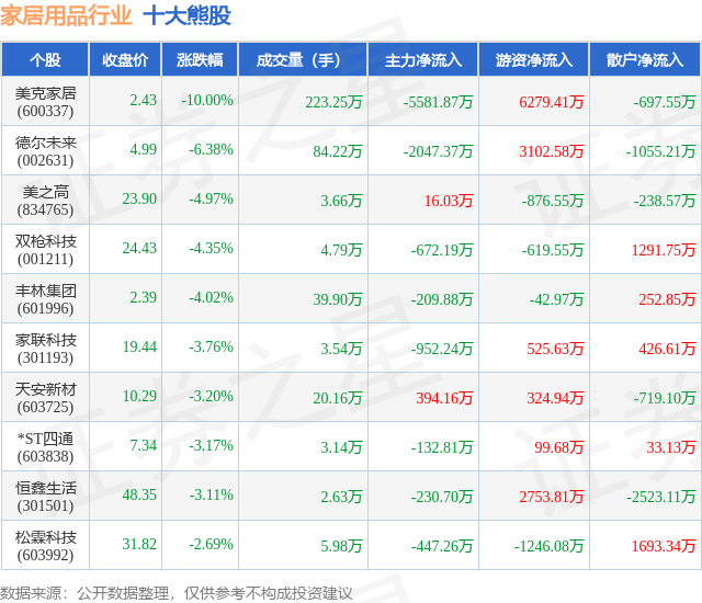 个股表现方面,家居用品行业当日领跌股为美克家居(600337),该股当日报收2.43,下跌10.0%,成交量223.25万,主力资金净流出5581.87万元。德尔未来(002631)以下跌6.38%紧随其后,该股当日成交量84.22万,主力资金净流出2047.37万元。除此之外,美之高(834765)、双枪科技(001211)、丰林集团(601996)均进入当日熊股之列。具体个股列表见下表: