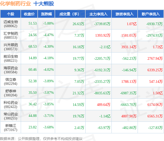 个股表现方面,化学制药行业当日领跌股为迈威生物(688062),该股当日报收51.53,下跌5.88%,成交量26.63万,主力资金净流出3739.85万元。汇宇制药(688553)以下跌4.47%紧随其后,该股当日成交量7.37万,主力资金净流入1393.92万元。除此之外,兴齐眼药(300573)、前沿生物(688221)、海辰药业(300584)均进入当日熊股之列。具体个股列表见下表: