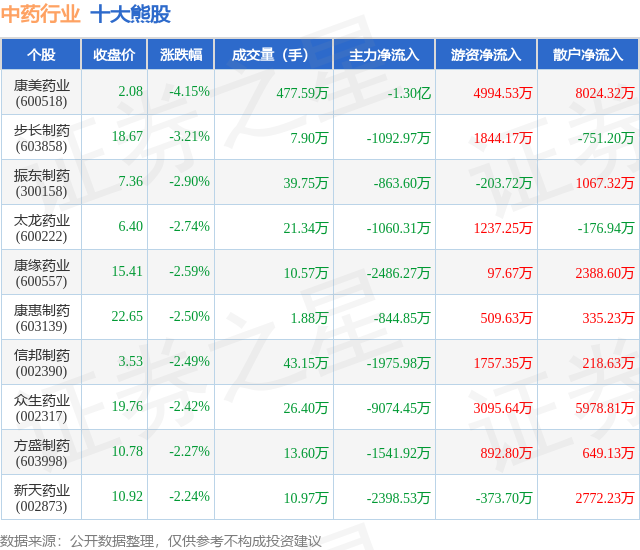 个股表现方面,中药行业当日领跌股为康美药业(600518),该股当日报收2.08,下跌4.15%,成交量477.59万,主力资金净流出1.3亿元。步长制药(603858)以下跌3.21%紧随其后,该股当日成交量7.9万,主力资金净流出1092.97万元。除此之外,振东制药(300158)、太龙药业(600222)、康缘药业(600557)均进入当日熊股之列。具体个股列表见下表: