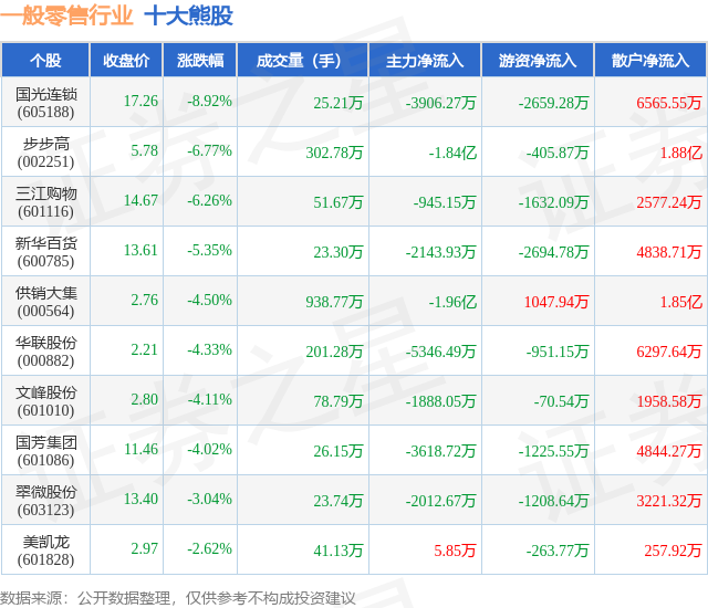 个股表现方面,一般零售行业当日领跌股为国光连锁(605188),该股当日报收17.26,下跌8.92%,成交量25.21万,主力资金净流出3906.27万元。步步高(002251)以下跌6.77%紧随其后,该股当日成交量302.78万,主力资金净流出1.84亿元。除此之外,三江购物(601116)、新华百货(600785)、供销大集(000564)均进入当日熊股之列。具体个股列表见下表:
