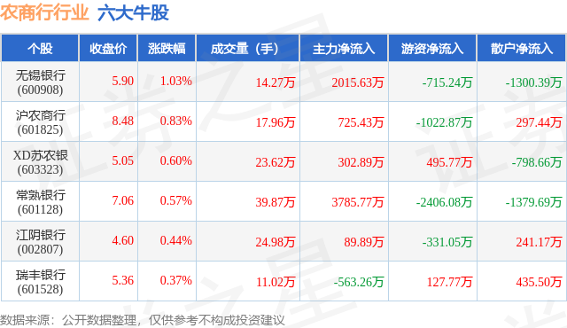 个股表现方面,农商行行业当日领涨股为无锡银行(600908),该股当日报收5.9,上涨1.03%,成交量14.27万,主力资金净流入2015.63万元。沪农商行(601825)以上涨0.83%紧随其后,该股当日成交量17.96万,主力资金净流入725.43万元。除此之外,XD苏农银(603323)、常熟银行(601128)、江阴银行(002807)均进入当日牛股之列。具体个股列表见下表: