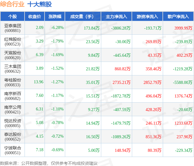 个股表现方面,综合行业当日领跌股为亚泰集团(600881),该股当日报收2.09,下跌6.28%,成交量173.84万,主力资金净流出3806.28万元。红棉股份(000523)以下跌1.79%紧随其后,该股当日成交量23.56万,主力资金净流出30.0万元。除此之外,天宸股份(600620)、三木集团(000632)、粤桂股份(000833)均进入当日熊股之列。具体个股列表见下表: