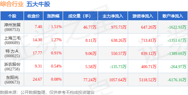 个股表现方面,综合行业当日领涨股为漳州发展(000753),该股当日报收7.4,上涨1.51%,成交量46.77万,主力资金净流入975.73万元。上海三毛(600689)以上涨1.27%紧随其后,该股当日成交量8.11万,主力资金净流入638.26万元。除此之外,特 力A(000025)、浙农股份(002758)、东阳光(600673)均进入当日牛股之列。具体个股列表见下表: