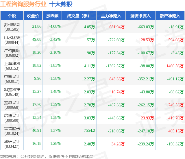 个股表现方面,工程咨询服务行业当日领跌股为苏州规划(301505),该股当日报收21.86,下跌4.08%,成交量4.05万,主力资金净流入681.94万元。山水比德(300844)以下跌3.42%紧随其后,该股当日成交量1.57万,主力资金净流出722.6万元。除此之外,广咨国际(836892)、上海建科(603153)、中衡设计(603017)均进入当日熊股之列。具体个股列表见下表: