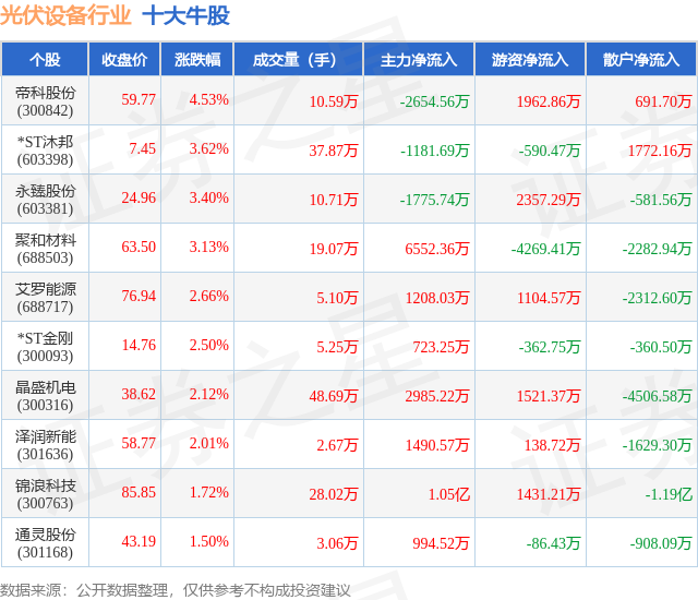 个股表现方面,光伏设备行业当日领涨股为帝科股份(300842),该股当日报收59.77,上涨4.53%,成交量10.59万,主力资金净流出2654.56万元。*ST沐邦(603398)以上涨3.62%紧随其后,该股当日成交量37.87万,主力资金净流出1181.69万元。除此之外,永臻股份(603381)、聚和材料(688503)、艾罗能源(688717)均进入当日牛股之列。具体个股列表见下表: