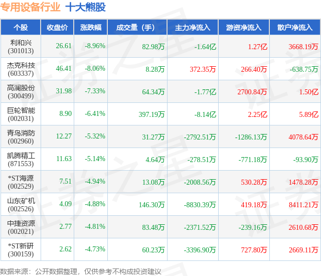 个股表现方面,专用设备行业当日领跌股为利和兴(301013),该股当日报收26.61,下跌8.96%,成交量82.98万,主力资金净流出1.64亿元。杰克科技(603337)以下跌8.06%紧随其后,该股当日成交量8.28万,主力资金净流入372.35万元。除此之外,高澜股份(300499)、巨轮智能(002031)、青鸟消防(002960)均进入当日熊股之列。具体个股列表见下表: