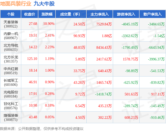 个股表现方面,地面兵装行业当日领涨股为天秦装备(300922),该股当日报收27.68,上涨10.9%,成交量24.5万,主力资金净流入7529.84万元。内蒙一机(600967)以上涨2.41%紧随其后,该股当日成交量90.93万,主力资金净流入1.88亿元。除此之外,北方导航(600435)、北方长龙(301357)、中兵红箭(000519)均进入当日牛股之列。具体个股列表见下表: