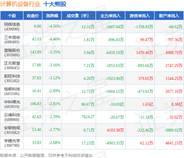个股表现方面,计算机设备行业当日领跌股为同辉信息(430090),该股当日报收8.8,下跌4.56%,成交量12.31万,主力资金净流出1607.04万元。三未信安(688489)以下跌4.46%紧随其后,该股当日成交量1.81万,主力资金净流出896.83万元。除此之外,慧翰股份(301600)、正元智慧(300645)、凯旺科技(301182)均进入当日熊股之列。具体个股列表见下表: