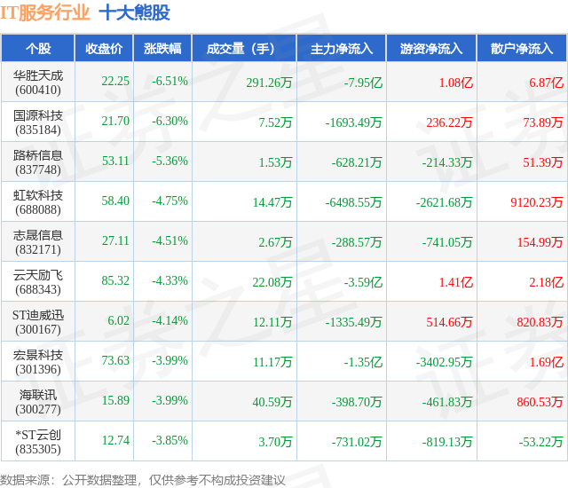 个股表现方面,IT服务行业当日领跌股为华胜天成(600410),该股当日报收22.25,下跌6.51%,成交量291.26万,主力资金净流出7.95亿元。国源科技(835184)以下跌6.3%紧随其后,该股当日成交量7.52万,主力资金净流出1693.49万元。除此之外,路桥信息(837748)、虹软科技(688088)、志晟信息(832171)均进入当日熊股之列。具体个股列表见下表: