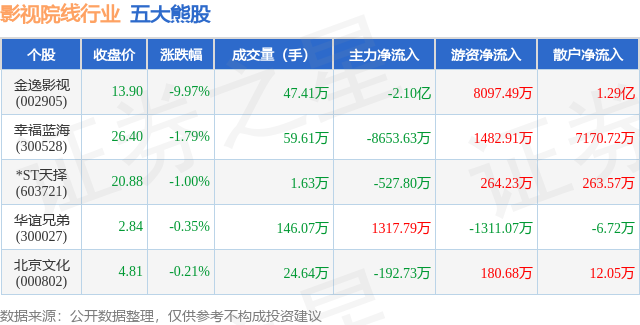 个股表现方面,影视院线行业当日领跌股为金逸影视(002905),该股当日报收13.9,下跌9.97%,成交量47.41万,主力资金净流出2.1亿元。幸福蓝海(300528)以下跌1.79%紧随其后,该股当日成交量59.61万,主力资金净流出8653.63万元。除此之外,*ST天择(603721)、华谊兄弟(300027)、北京文化(000802)均进入当日熊股之列。具体个股列表见下表: