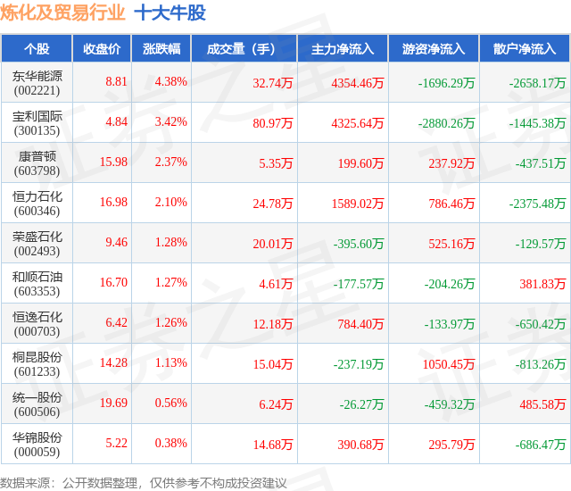个股表现方面,炼化及贸易行业当日领涨股为东华能源(002221),该股当日报收8.81,上涨4.38%,成交量32.74万,主力资金净流入4354.46万元。宝利国际(300135)以上涨3.42%紧随其后,该股当日成交量80.97万,主力资金净流入4325.64万元。除此之外,康普顿(603798)、恒力石化(600346)、荣盛石化(002493)均进入当日牛股之列。具体个股列表见下表: