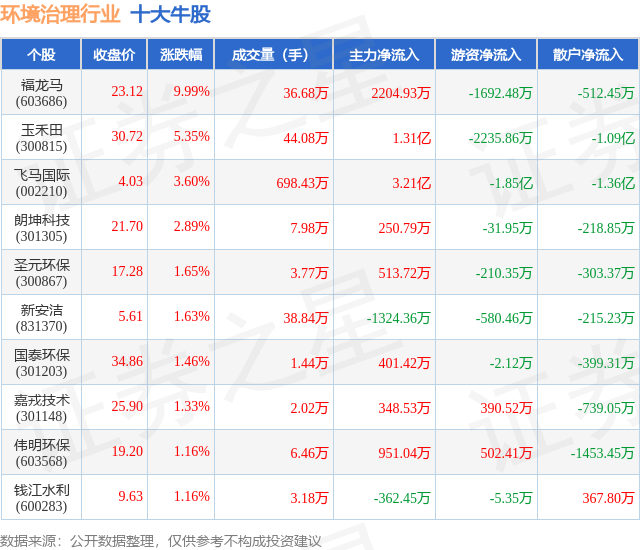 个股表现方面,环境治理行业当日领涨股为福龙马(603686),该股当日报收23.12,上涨9.99%,成交量36.68万,主力资金净流入2204.93万元。玉禾田(300815)以上涨5.35%紧随其后,该股当日成交量44.08万,主力资金净流入1.31亿元。除此之外,飞马国际(002210)、朗坤科技(301305)、圣元环保(300867)均进入当日牛股之列。具体个股列表见下表: