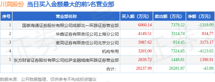 证券之星消息,沪深交易所2025年9月19日公布的交易公开信息显示,川润股份(002272)因日换手率达到20%的前5只证券登上龙虎榜。此次是近5个交易日内第2次上榜。