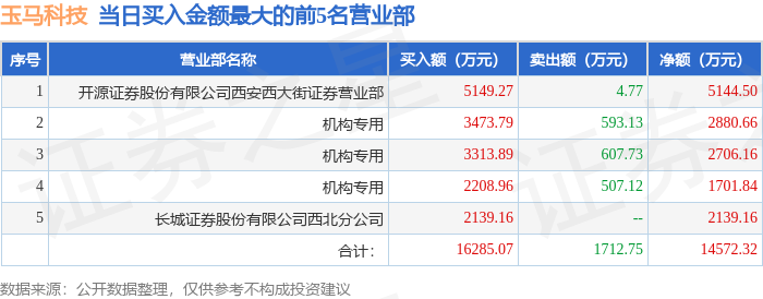 证券之星消息,沪深交易所2025年9月19日公布的交易公开信息显示,玉马科技(300993)因日涨幅达到15%的前5只证券登上龙虎榜。此次是近5个交易日内第1次上榜。