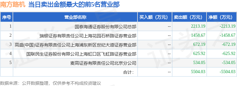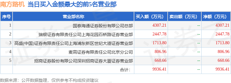 证券之星消息,沪深交易所2025年9月19日公布的交易公开信息显示,南方路机(603280)因有价格涨跌幅限制的日换手率达到20%的前五只证券登上龙虎榜。此次是近5个交易日内第1次上榜。