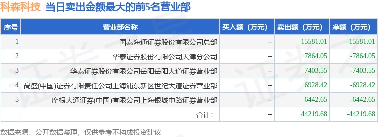 截至2025年9月19日收盘,科森科技(603626)报收于15.93元,下跌10.0%,跌停,换手率35.63%,成交量197.71万手,成交额33.94亿元。
