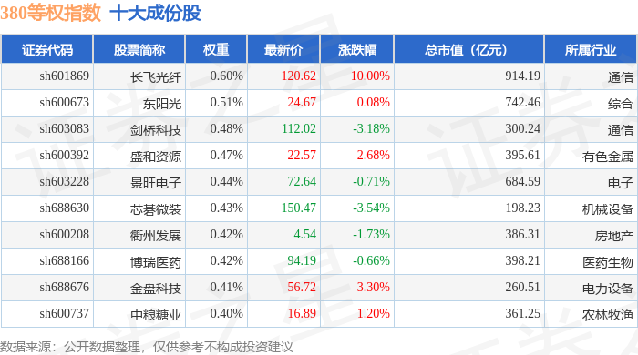 证券之星消息,9月19日,380等权(000115)指数报收于8544.78点,涨0.14%,成交2249.44亿元,换手率2.34%。当日该指数成份股中,上涨的有217家,长飞光纤以10.0%的涨幅领涨,下跌的有156家,上海建工以10.05%的跌幅领跌。