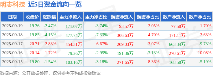 证券之星消息,截至2025年9月19日收盘,明志科技(688355)报收于19.36元,下跌2.47%,换手率1.88%,成交量2.33万手,成交额4571.08万元。