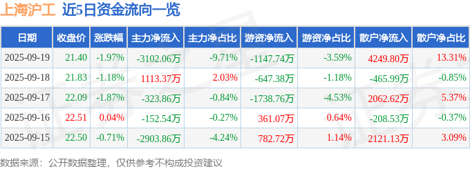 证券之星消息,截至2025年9月19日收盘,上海沪工(603131)报收于21.4元,下跌1.97%,换手率4.67%,成交量14.84万手,成交额3.19亿元。