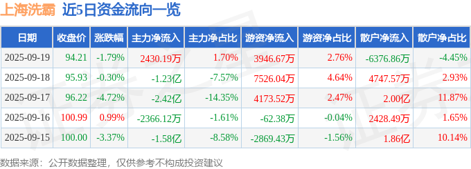 证券之星消息,截至2025年9月19日收盘,上海洗霸(603200)报收于94.21元,下跌1.79%,换手率8.46%,成交量14.85万手,成交额14.32亿元。