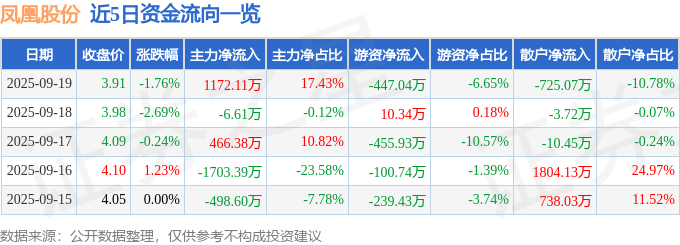 证券之星消息,截至2025年9月19日收盘,凤凰股份(600716)报收于3.91元,下跌1.76%,换手率1.84%,成交量17.26万手,成交额6724.38万元。