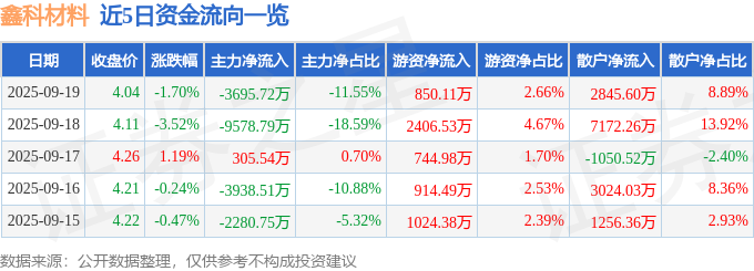 证券之星消息,截至2025年9月19日收盘,鑫科材料(600255)报收于4.04元,下跌1.7%,换手率4.36%,成交量78.66万手,成交额3.2亿元。
