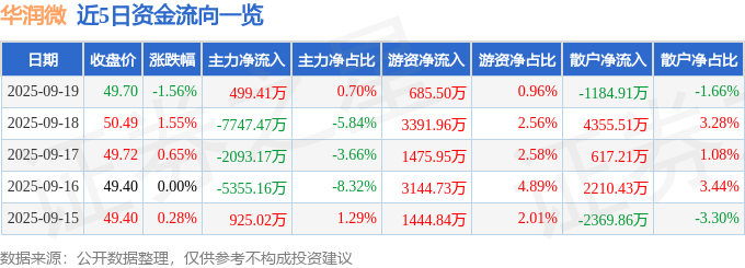 证券之星消息,截至2025年9月19日收盘,华润微(688396)报收于49.7元,下跌1.56%,换手率1.07%,成交量14.16万手,成交额7.15亿元。