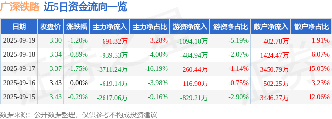 证券之星消息,截至2025年9月19日收盘,广深铁路(601333)报收于3.3元,下跌1.2%,换手率1.13%,成交量63.86万手,成交额2.11亿元。