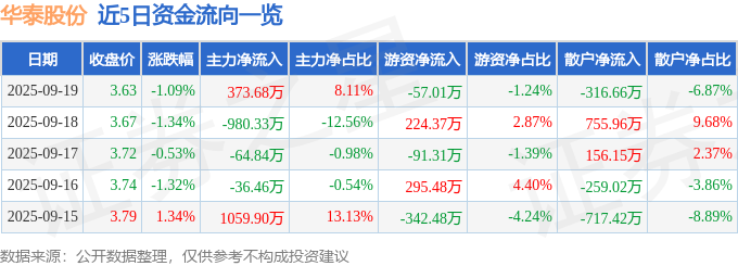 证券之星消息,截至2025年9月19日收盘,华泰股份(600308)报收于3.63元,下跌1.09%,换手率0.84%,成交量12.67万手,成交额4606.42万元。