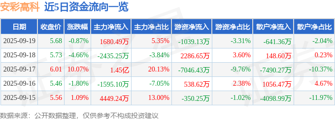 证券之星消息,截至2025年9月19日收盘,安彩高科(600207)报收于5.68元,下跌0.87%,换手率5.12%,成交量55.79万手,成交额3.14亿元。