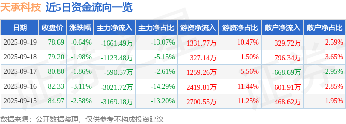 证券之星消息,截至2025年9月19日收盘,天承科技(688603)报收于78.69元,下跌0.64%,换手率3.39%,成交量1.61万手,成交额1.27亿元。