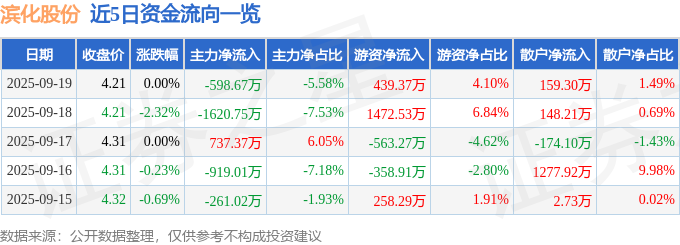 证券之星消息,截至2025年9月19日收盘,滨化股份(601678)报收于4.21元,上涨0.0%,换手率1.26%,成交量25.51万手,成交额1.07亿元。