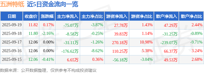证券之星消息,截至2025年9月19日收盘,五洲特纸(605007)报收于11.82元,上涨0.17%,换手率0.41%,成交量1.65万手,成交额1939.17万元。