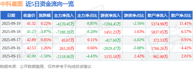 证券之星消息,截至2025年9月19日收盘,中科星图(688568)报收于41.32元,上涨0.22%,换手率1.41%,成交量11.36万手,成交额4.71亿元。