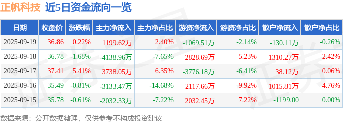 证券之星消息,截至2025年9月19日收盘,正帆科技(688596)报收于36.86元,上涨0.22%,换手率4.58%,成交量13.41万手,成交额5.01亿元。