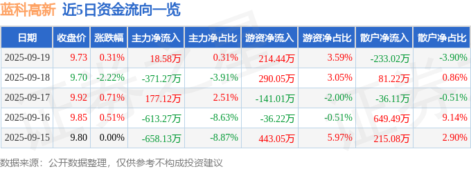 证券之星消息,截至2025年9月19日收盘,蓝科高新(601798)报收于9.73元,上涨0.31%,换手率1.73%,成交量6.14万手,成交额5976.75万元。