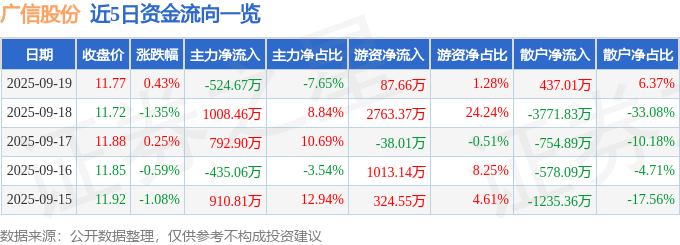 证券之星消息,截至2025年9月19日收盘,广信股份(603599)报收于11.77元,上涨0.43%,换手率0.64%,成交量5.83万手,成交额6860.04万元。